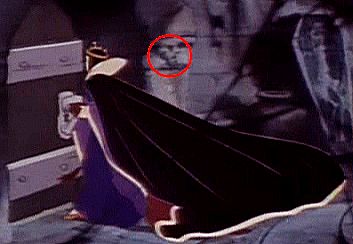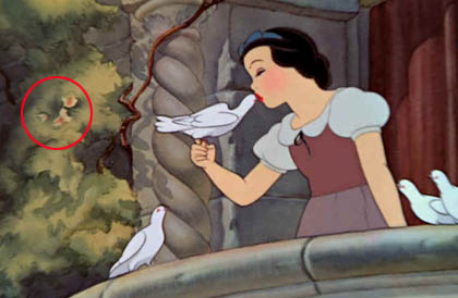 在本片中壞心皇后的地下囚牢裡,門邊有一個一大圓、兩小圓米奇頭形的石雕喔!