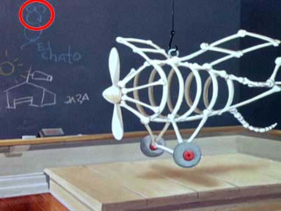 在本片中“小飛機培卓”那段,飛機學苑的黑板上有用粉筆畫的一隻老鼠,頭部正是一個米奇頭!