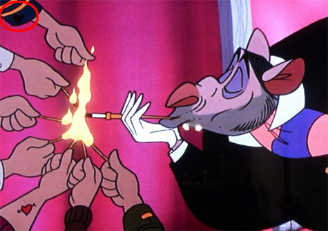 片中當大壞蛋瑞根和其他鼠輩手下在合唱“The World's Greatest Criminal Mind”那首歌的時候,有一幕的右上方,出現了一個白色的米奇頭。(網友lokatv提供)