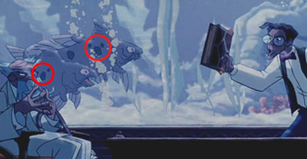 當邁羅被請到祖父生前好友大富豪普斯頓韋摩的住宅,他們兩人對談時背後有個大魚池,魚的身上兩面都有一大圓兩小圓的米奇斑喔!