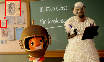 雞丁與同學上「羊語課」的那一段,在教室左前方的佈告欄上貼了許多東西,其中有一張有米奇的畫像。