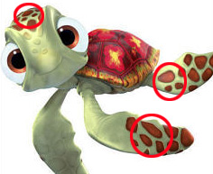 【海底總動員】片中的小海龜小古身上的斑點之中,藏著許多一大圓、兩小圓的米奇頭。