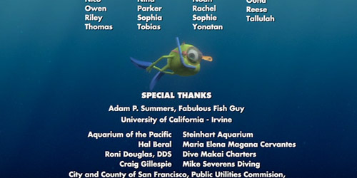 在本片最後播放片尾字幕的時候,許多角色都會在字幕旁邊游出來,其中還包括【怪獸電力公司】的大眼仔,居然也游出來亮相!