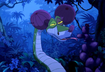 當男孩毛克利和巴魯在唱“The Bare Necessities"歌曲到最後時,大蛇卡奧想趁機吃掉男孩,結果被毛克利用水果砸到,結果悲慘的他此時的頭看起來就像一個米奇頭。