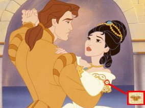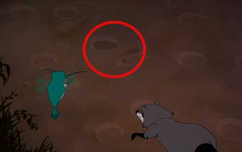 在莊邁斯、羅強恩救出寶嘉康蒂後要返回家中,鏡頭立刻轉到米糕和波斯這兩隻小動物,他們經過一個泥土地面,在那個地面上有一個一大圓、兩小圓的隱藏米奇頭喔!