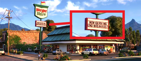 伊恩上學前來到的漢堡店,招牌寫著「開始販售第二次早餐」,而這事實上這是【哈比人】的彩蛋,在【哈比人】的設定裡,哈比人的正餐包含早餐、第二頓早餐、午前茶點、午餐、下午茶、晚餐及宵夜。(網友tony stark 提供)
