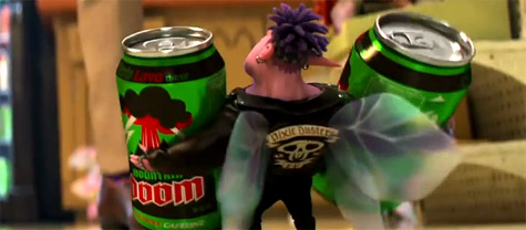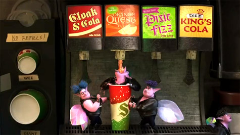 不光是比薩星球改成了比薩王國,片中許多品牌都惡搞了現實的品牌名稱,比如 Coca-Cola 變成 Cloak & Cola (斗篷可樂);Mountain Dew 變成了 Mountain Doom (末日山)……等等。(網友tony stark 提供)