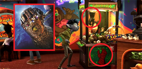 片中酒館的抓娃娃機台名字為「手套」(Gauntlet),很明顯看到爪子的造型正是【復仇者聯盟:無限之戰】中的無限手套,機台上的無限手套還拿著一顆綠色的寶石,像是時間寶石∼(網友tony stark 提供)