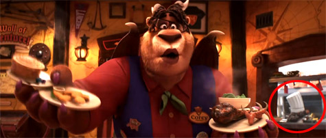 來自皮克斯1986年短片【頑皮跳跳燈】的皮球,也是皮克斯電影的公式彩蛋之一。這次出現在兩兄弟進到酒館裡,大門打開遠處牆上就出現皮球的圖案。(網友tony stark 提供)