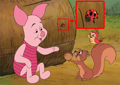 在本片中,小豬感到自己太嬌小,無法幫朋友的忙,因此有點沮喪,當他獨自一人靠在木頭旁邊時,身旁飛來一隻瓢蟲,身上有一大圓、兩小圓的米奇頭喔!