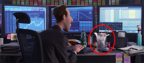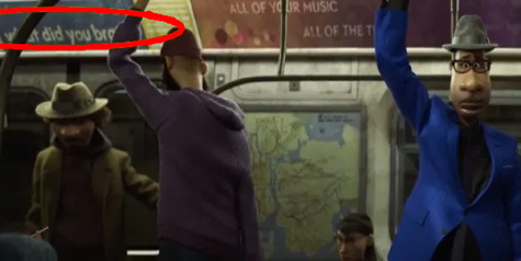 地鐵車廂有一個橫幅廣告,寫著「What did you brang?」,這是出自【腦筋急轉彎】片中,主角女孩萊莉的爸爸就是在「brang」這家公司工作舉家遷往舊金山,這家公司的