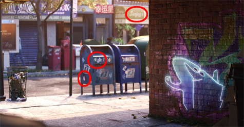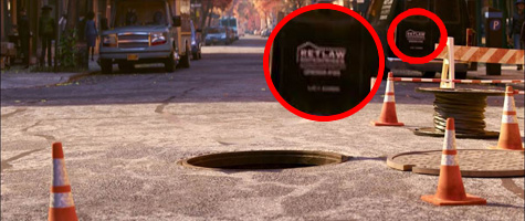 以下這一幕當中,泰瑞準備要偷襲,注意垃圾箱上的貼紙,有一個是【瓦力】中的企業「Buy n