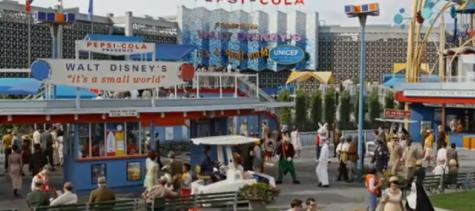 在【明日世界】電影當中, 重現了當年1964年迪士尼參與舉辦的紐約世界博覽會,當年華特迪士尼在此博覽會上推出包括『小小世界』等幾項遊樂設施,後來都成為迪士尼樂園裡的設施。在【明日世界】片中不但『小小世界』設施扮演重要的一幕,博覽會上還有出現一些迪士尼裝扮人物,包括【愛麗絲夢遊仙境】的白兔、【三隻小豬】的大野狼等等。