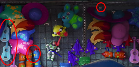 遊戲攤位的玩具獎品,有出現【可可夜總會】的吉他、比薩星球的火箭,還有皮克斯彩球圖案的獎品。