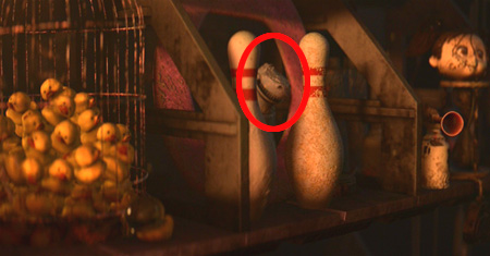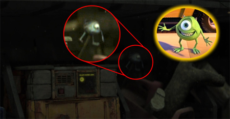 在瓦力的收藏櫃上有好多特別的東西,包括有一個【玩具總動員】抱抱龍的模型 、【怪獸電力公司】的大眼仔,還有一個打火機上面是石油公司 Dinoco 的標誌!這幕出現在電影開場沒多久,瓦力剛回到家打開家門,光線透入他的家中。