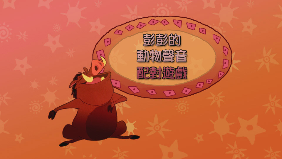 除了之前介紹的視聽表現,迪士尼【獅子王】二碟精裝版DVD還有很多特別的地方,光是以3D動畫呈現的DVD選單,就已經頗讓人驚艷了,還有收錄更多更特別的東西,包括全新製作的好幾個DVD遊戲,你不但可以坐在家中和彭彭、丁滿來一場非洲虛擬狩獵冒險;還可以與彭彭一同猜猜動物的叫聲;再來性格分析一下你最像【獅子王】裡的哪一個角色;甚至還有一個首創DVD遊戲中可以兩人一同競賽的捉蟲蟲遊戲喔!