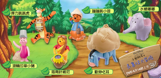 為了幫迪士尼【小熊維尼之長鼻怪大冒險】影音產品6月14日在台發行造勢,台灣麥當勞也將推出【小熊維尼之長鼻怪大冒險】快樂兒童餐玩具,上檔時間是在6月8日之後。