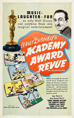【迪士尼金獎動畫特集】 Walt Disney's Academy Award Revue 迪士尼的首部長篇電影是1937年12月推出上映的【白雪公主】,但其實在該年5月時,迪士尼有特別限期在美國戲院播映了一部電影【迪士尼金獎動畫特集】(Walt Disney's Academy Award Revue,英文片名又作【Academy Award Review of Walt Disney Cartoons】),是將之前得過奧斯卡的幾部『糊塗交響曲』(Silly Symphonies)系列短篇動畫作品集結,也是幫年底即將推出的【白雪公主】作宣傳。 這部集結金獎作品的【迪士尼金獎動畫特集】,全長41分鐘共包括五部作品,分別是1932年的【花與樹】(Flowers and Trees)、1933年的【三隻小豬】(Three Little Pigs)、1934年的【龜兔賽跑】(The Tortoise and the Hare)、1935年的【三小貓】(Three Orphan Kittens)和1936年的【鄉下老鼠】(The Country Cousin),都是獲得奧斯卡金像獎最佳短篇動畫的作品。後來在1966年本片有重映,加長為74分鐘,多收錄了四段內容,分別是1937年的【老磨坊】(The Old Mill)、1938年的【公牛費迪南】(Ferdinand the Bull)、1939年的【醜小鴨】(The Ugly Duckling)以及1941年的【伸出援手】(Lend a Paw)。 這些由華特迪士尼所製作的短篇作品,當初都是安排在戲院正規電影播映前觀眾陸續入座時所播映,這也是早期那個年代大家對卡通動畫的定位,而迪士尼所製作的這些短片頗受歡迎,受到了奧斯卡的肯定,也是基於此點迪士尼才進一步要推出一部完全是動畫的長篇電影,當時發行的片商 RKO Radio Pictures 自然也不知市場是否能接受,因此就先發行了這樣的短篇合集電影來試試觀眾的接受度。當年最早推出上映的【迪士尼金獎動畫特集】每段落之間有旁白引言介紹,但到了後來再推出時旁白就被拿掉了。【迪士尼金獎動畫特集】所收錄的這些動畫短片,每段後來都有發行過影音產品,但以這樣一部長篇電影的安排形式只有在日本有發行過影音產品。 【迪士尼金獎動畫特集】的許多段內容也都曾經有在台灣發行過影音產品。 |