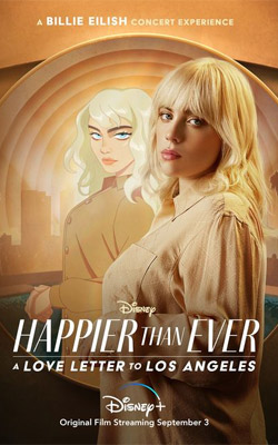 【Happier Than Ever:給洛杉磯的情書】 Happier Than Ever 【Happier Than Ever:給洛杉磯的情書】是迪士尼於2021年9月3日推出的一部音樂會電影,是美國創作歌手怪奇比莉(Billie Eilish)同名專輯《Happier Than Ever》的音樂會影像作品,安排在 Disney+ 影音平台上獨家推出。 美國創作歌手 Billie Eilish 在2019年發行首張錄音室專輯《當我們睡了,怪事發生了》(When We All Fall Asleep, Where Do We Go?)獲得大成功,一舉拿下葛萊美獎年度專輯、年度製作、年度歌曲和最佳新人等大獎。於是兩年後2021年7月又發行了後續專輯《怪樂的不得了》(Happier Than Ever),而本片【Happier Than Ever:給洛杉磯的情書】在同年稍後於 Disney+ 推出,這部音樂會電影按照專輯的曲目順序,將一首一首歌曲影像化。Billie Eilish 的《怪樂的不得了》這張專輯是在洛杉磯住宅地下室的家庭錄音室錄製的,錄製時間在2020年4月到2021年2月之間,也是 Covid-19 新冠疫情肆虐的時刻,Billie Eilish 呈現出她自然率性的曲風,雖然專輯名稱叫做「Happier Than Ever」,但她在專輯發行前就透露說「這張專輯中幾乎沒有一首歌是快樂的」,是一張十分有個人風格的專輯。 本片由 Michelle An 、Chelsea Dodson 、Juliet Tierney 等製片,演唱會現場的製作則是 Nicholas Jacobovitz ,導演為 Robert Rodriguez ,而 Patrick Osborne 擔任共同執導。片中部份音樂有洛杉磯交響樂團、洛杉磯兒童合唱團等參與。 【Happier Than Ever:給洛杉磯的情書】如今已在台灣 Disney+