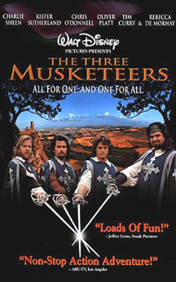 【豪情三劍客】 The Three Musketeers 【豪情三劍客】(The Three Musketeers)是迪士尼於1993年所出品的電影,當時迪士尼製作這部源自法國的世界名著,適逢巴黎迪士尼樂園開張,故本片與樂園有相互搭配造勢的宣傳,在本片海報、原聲帶…等週邊商品上都還印有『歐洲迪士尼樂園』的標誌(歐洲迪士尼樂園後來才改名為巴黎迪士尼樂園)。 《三劍客》這部由法國文豪大仲馬所寫的世界名著,已經有多次改編成為各種題材作品的紀錄。這故事是敘述有一位一心想成為皇家侍衛的年輕人 D'Artagnan ,他與侍衛隊的三劍客共同護衛法國國王路易十四,對抗主教等一群圖謀不軌的野心份子。這部膾炙人口的小說一直是各世代讀者喜愛的作品,迪士尼此次重新詮釋此一世界名著,再度將這傳奇呈現在大螢幕上,票房成績也不俗。 本片是由 Stephen Herek 所執導,他還執導過迪士尼電影【野鴨變鳳凰】以及【101真狗】。演員方面由 Chris O'Donnell 飾演主角青年 D'Artagnan ,三劍客方面, Charlie Sheen 飾演 Aramis ; Kiefer Sutherland 飾演 Athos ; Oliver Platt 飾演 Porthos ,邪惡的主教 Cardinal Richelieu 則由 Tim Curry 擔任。本片配樂由 Michael Kamen 負責,而 Bryan Adams 所創作的主題曲“All For Love”,由 Bryan Adams 、Rod Stewart 和 Sting 共同演唱,紅極一時頗為暢銷。本片原聲帶是由 A&M 唱片所出版。 【豪情三劍客】在台灣目前只有推出過出租版的錄影帶,至於原聲帶當時是由寶麗金唱片所出版,但是如今已經絕版多年。本片已經於台灣的迪士尼頻道播出過。 |